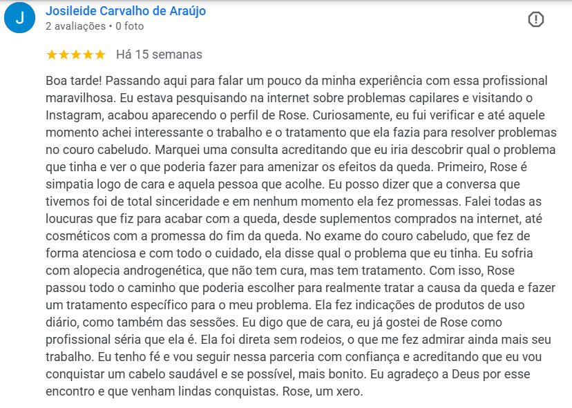 Olá, Eu sou Rose Melo, TRICOLOGISTA pós graduada, tenho várias especializações, dentre elas, em queda capilar e cuidados pré e pós implante capilar.